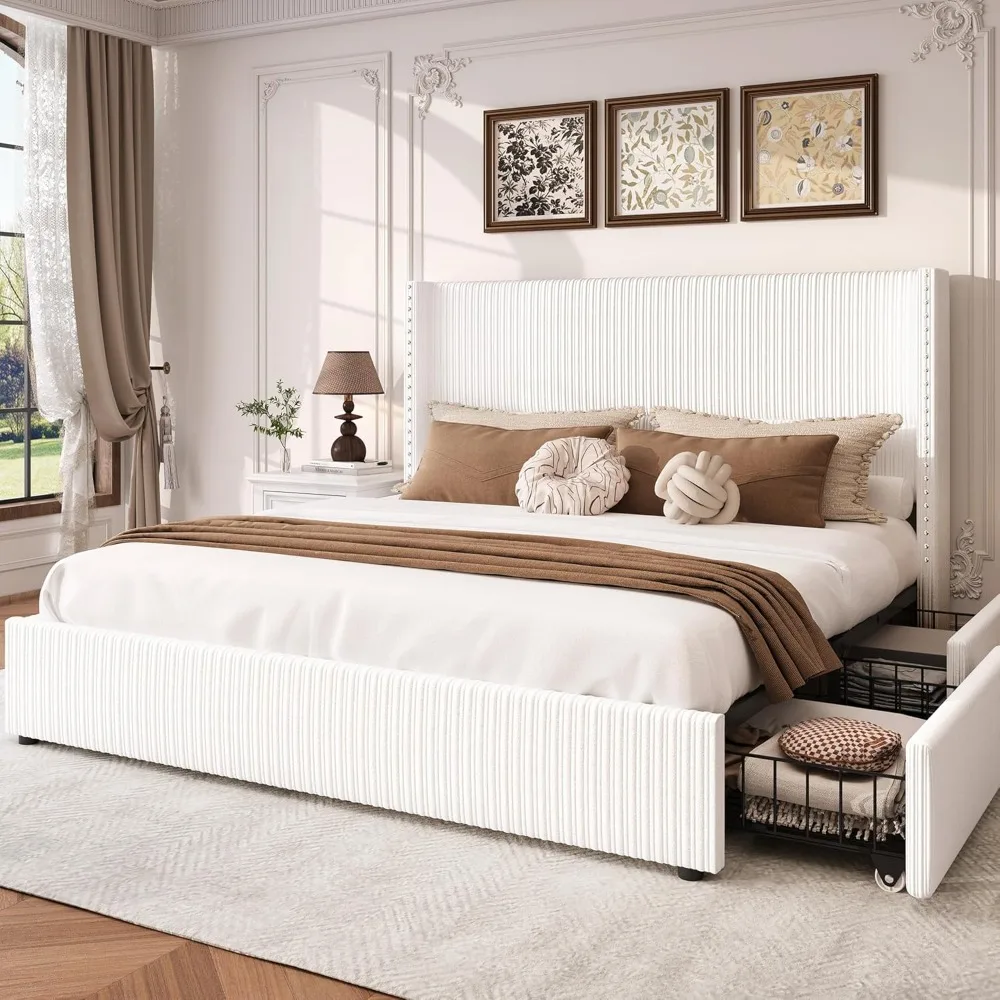 larmace queen bed frame with 4 storage drawers, upholstered bed frame queen size with headboard corduroy platform bed frame with