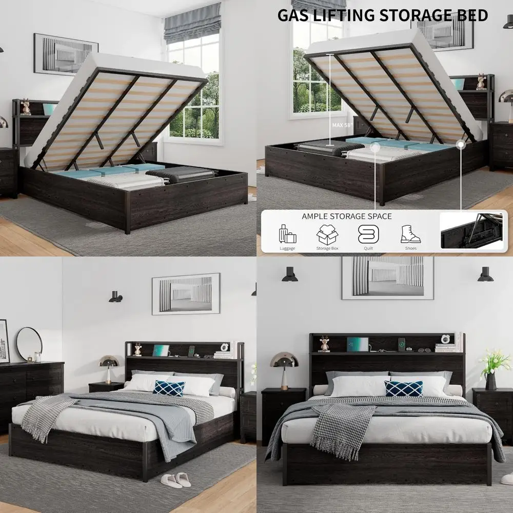 Queen Size Storage Bed with Lift-Up Platform and Charging Station, Wood Headboard, No Box Spring Needed