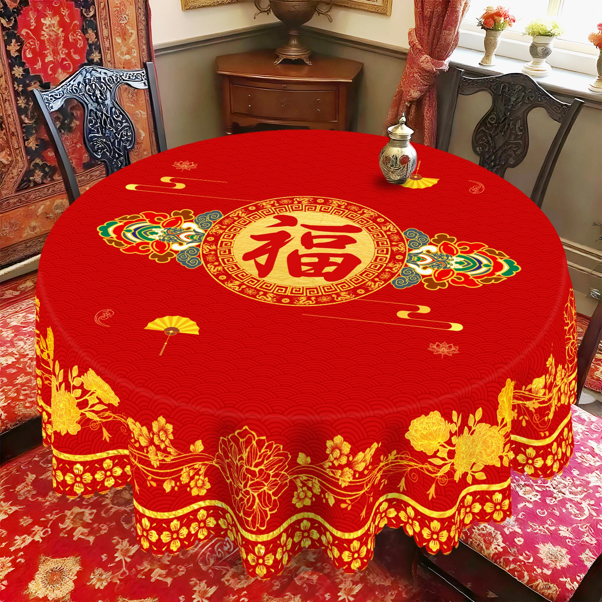 1 Piece of Red Round Tablecloth with Blessing Characters, 5 Sizes, Spring Festival Red Peony Printed Square Tablecloth, Edge Embossing Process, Chinese New Year Table Decoration, Tablecloth for Daily