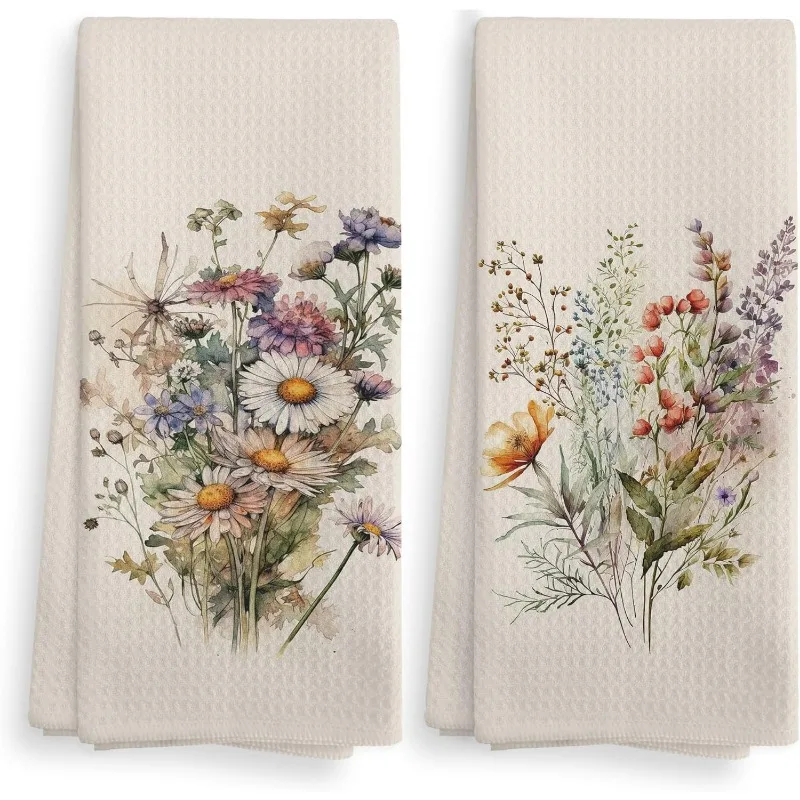Two Vintage Floral Kitchen Towels, 24x16 Inch Super Soft Woven Polyester, Modern Daisy and Wildflower Design, Machine Washable F