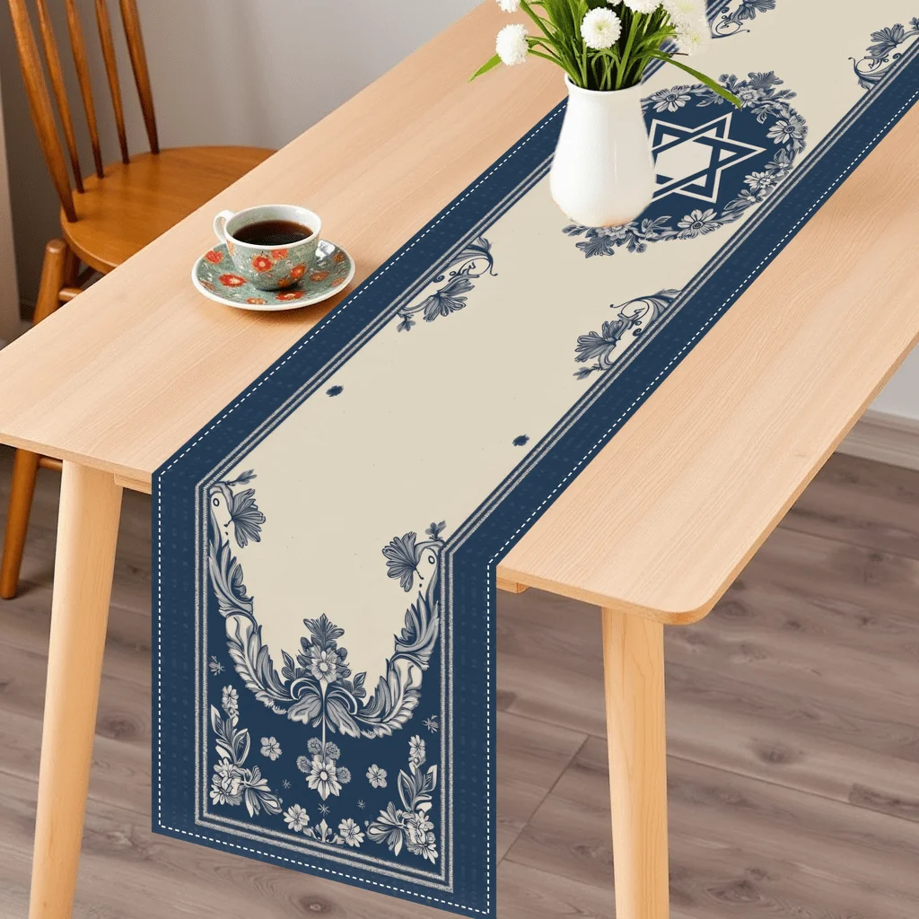 Happy Passover Blue Linen Table Runner Passover Decorations Spring Flowers Jewish David Star Table Runners Dining Table Decor