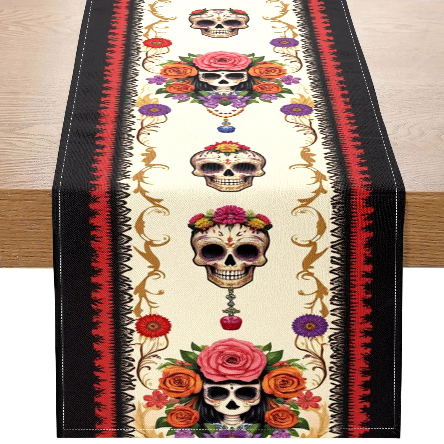 1 Piece of Mexican Day of the Dead Themed Table Runner, Decorated with Skull and Floral Patterns, Suitable for Day of the Dead Celebrations, Exotic Style Parties, Etc