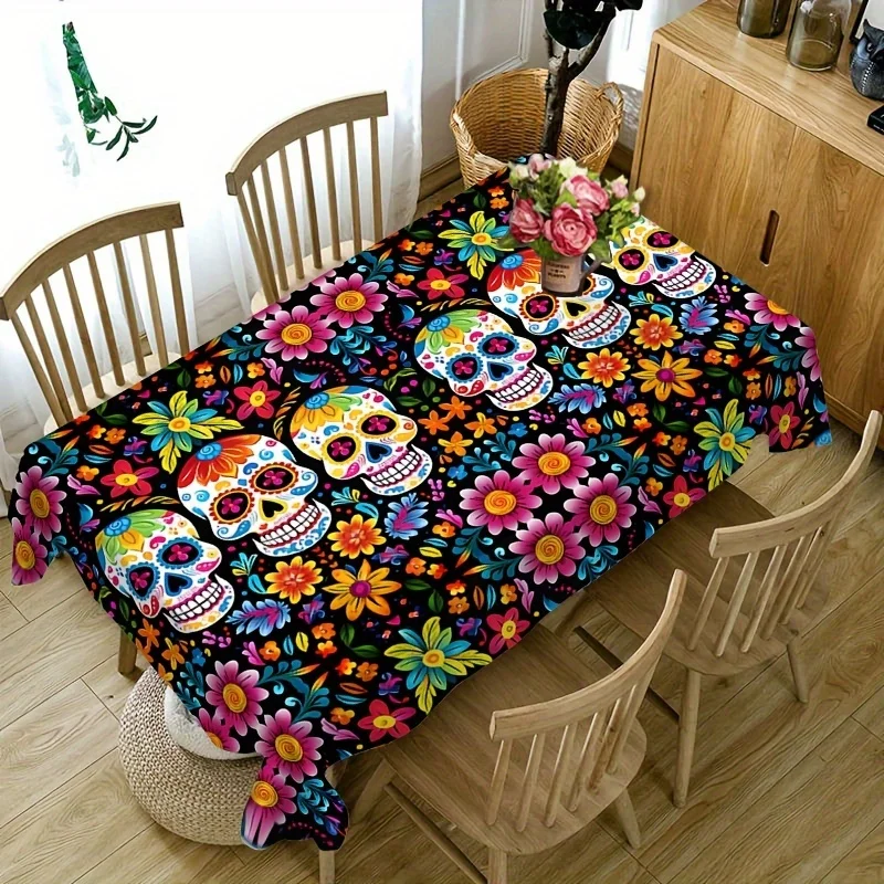 Mexican Day of The Dead Skull Flower Waterproof Tablecloth Table Decor Reusable Kitchen Dining Tablecloth Holiday Party Decor
