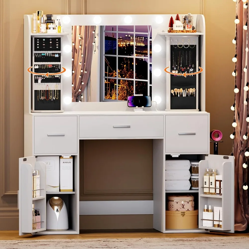 Vanity Desk with Rotating Jewelry Organizers, Makeup Vanity with Mirror and Lights, Dressing Table with USB-C Charging Station