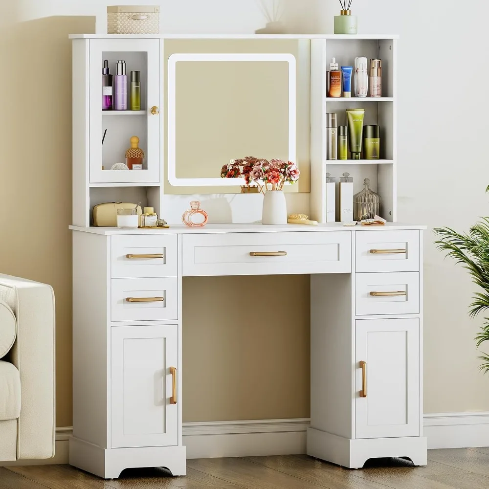 Modern Mini Dressing Table with LED-Lit Mirror (3 Color Temp, Dimmable) - Hidden Storage & Multi-Tier Dust-Proof Shelves, (White)
