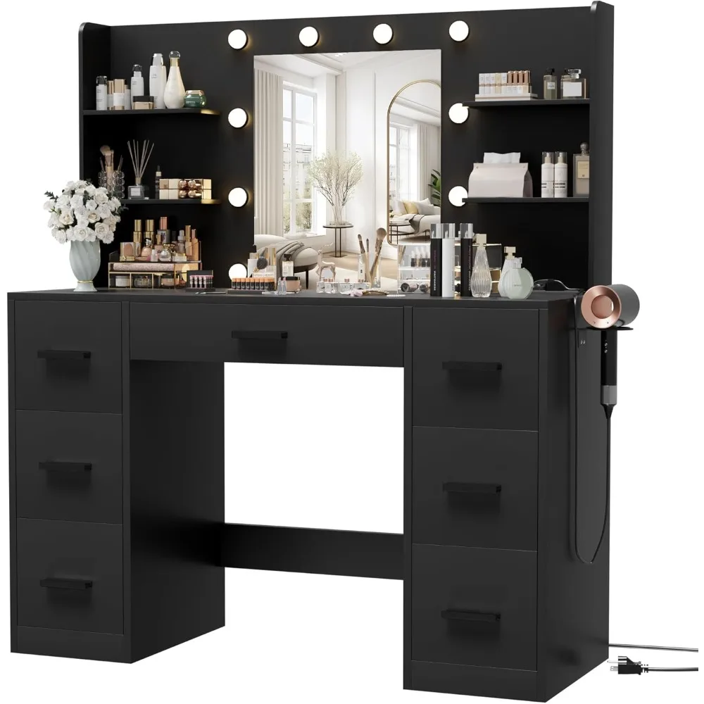 Vanity Desk with Mirror and Lights, Power Outlet Makeup Vanity Table with 3 Drawers and 7 Shelves Dressing Table with Storage