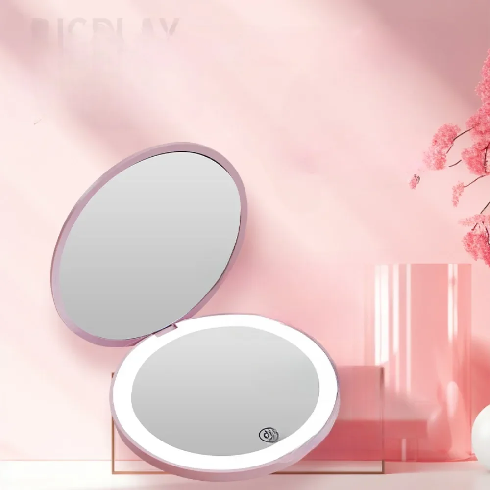 Personalized Small LED Light Cosmetic 2 Side Folding Makeup Compact Pocket Mirror Women Luminous Effect Pink White Mini Mirror