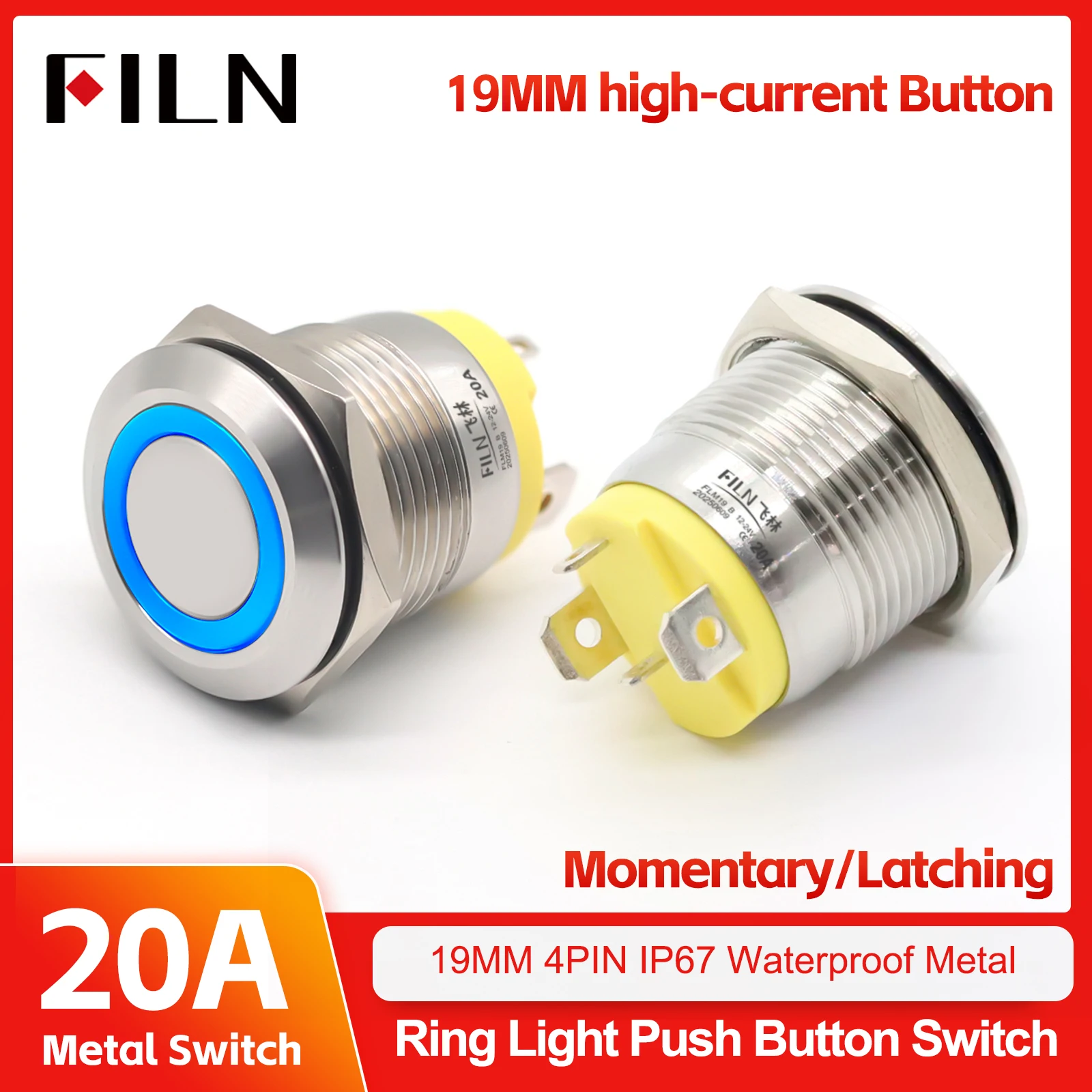 FILN IP67 22mm 20A Waterproof Metal Button Stainless Steel Push Button Switch 12V 24V 110V 220V High Current Flat Ring Round
