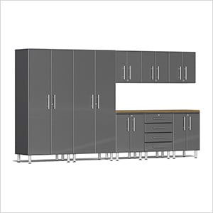 Proslat Garage Cabinets 9-Piece Glossy Grey Cabinet Set with Black Handles and Stainless Steel Worktop