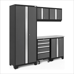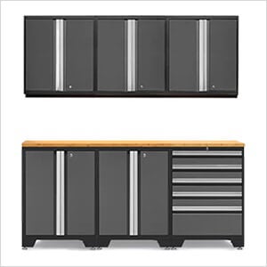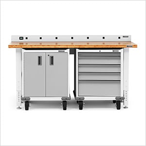 This NewAge Products tool cabinet storage set is crafted with sturdy 18-gauge steel frames, 19-gauge double-wall drawer fronts, and a durable bamboo work surface.
