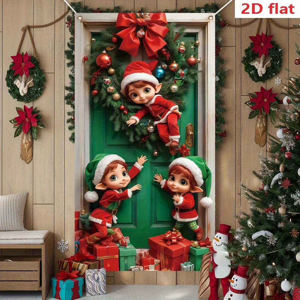 2D flat 1 Christmas elf polyester door banner - green door curtain with elves and gifts, holiday home decoration door curtain
