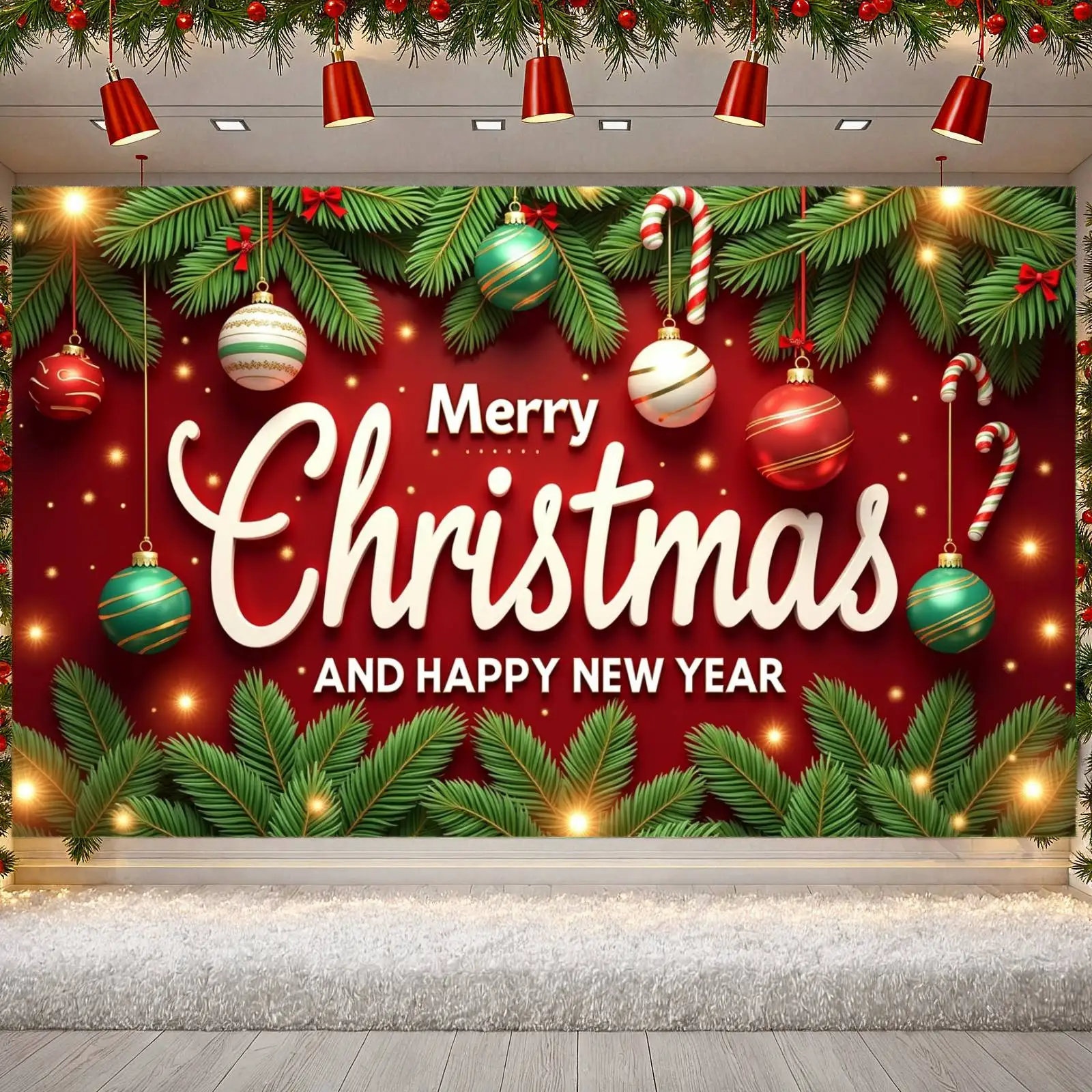 Christmas Backdrop Banner Candy Cane & Silver Tinsel White Snowy, Festive "Merry Christmas" With Arch Christmas Trees, Balloons