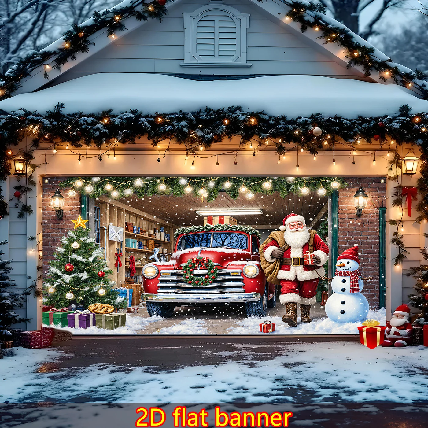 1pc giant red vintage truck Christmas banner, Santa Claus and Snowman - Heavy outdoor/garage door decoration, Christmas party