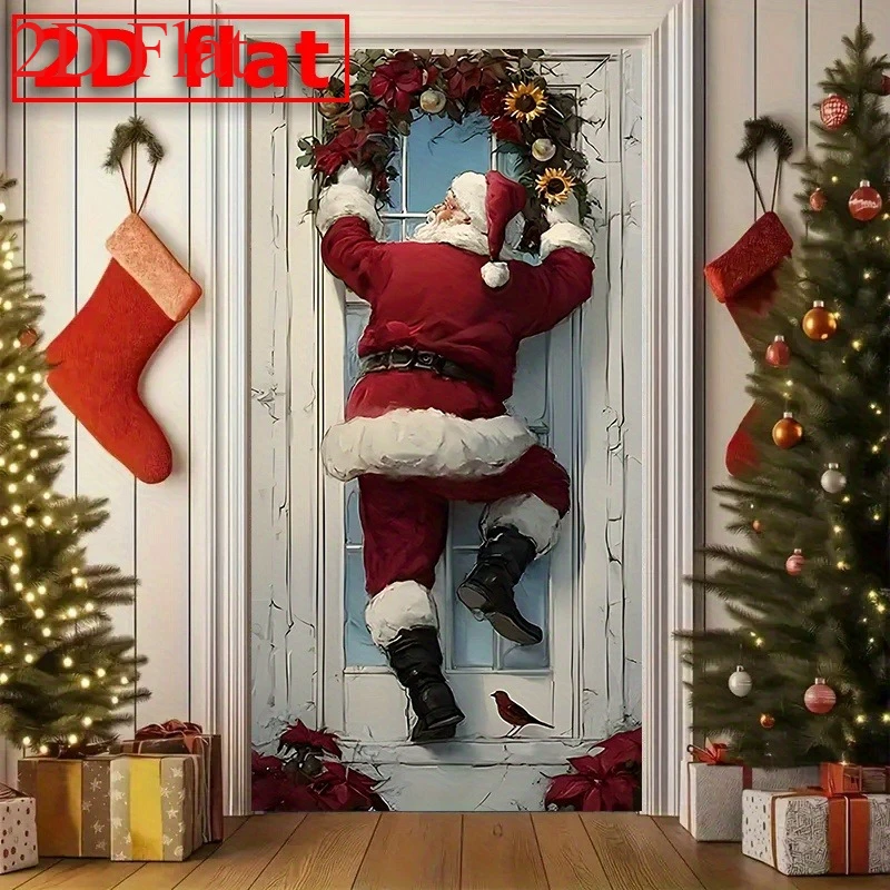 2D flat Santa Claus door banner, Santa Claus climbs through the door with wreaths and gifts - durable polyester