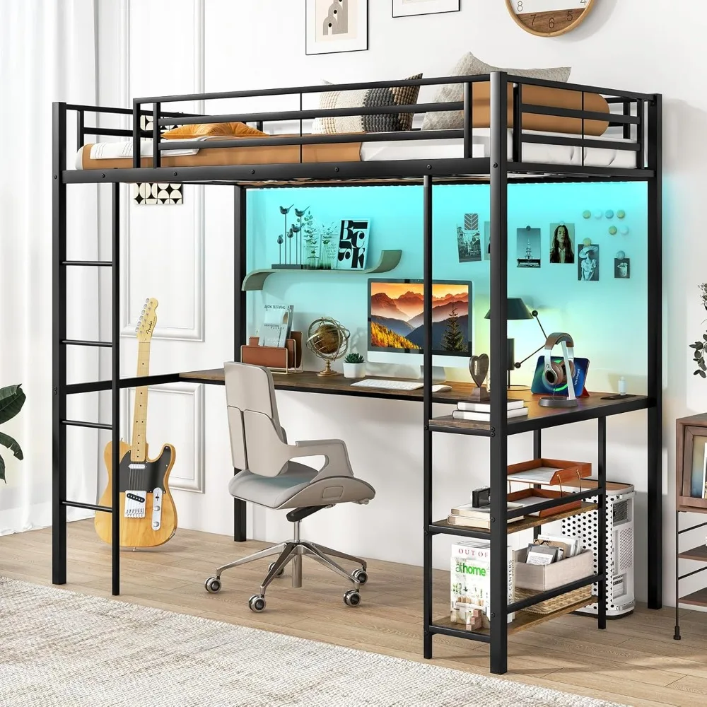 Metal Staircase Loft Bed with Desk, Shelf, and RGB Lighting Storage