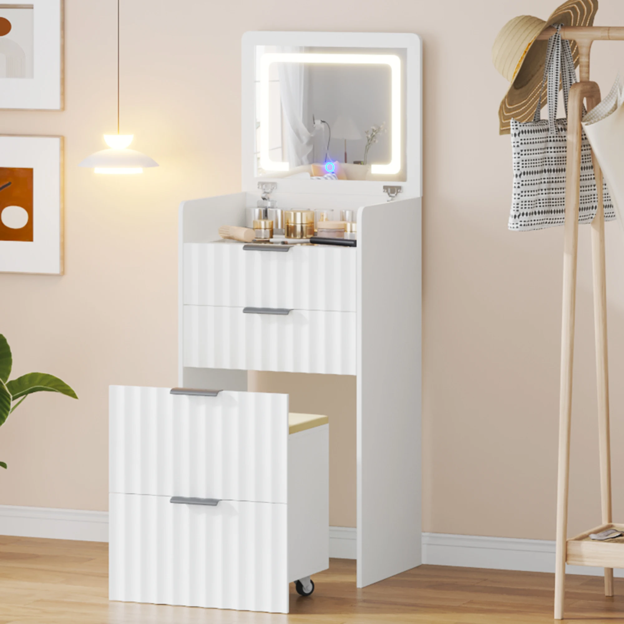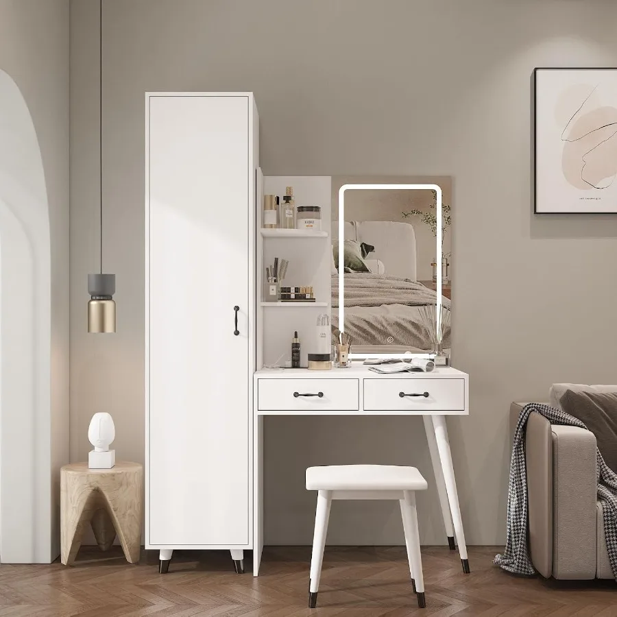 Vanity Desk with Mirror and Lights Makeup Vanity Table Set with Charging Station White Desk with Small Wardrobe 2 Drawers Open