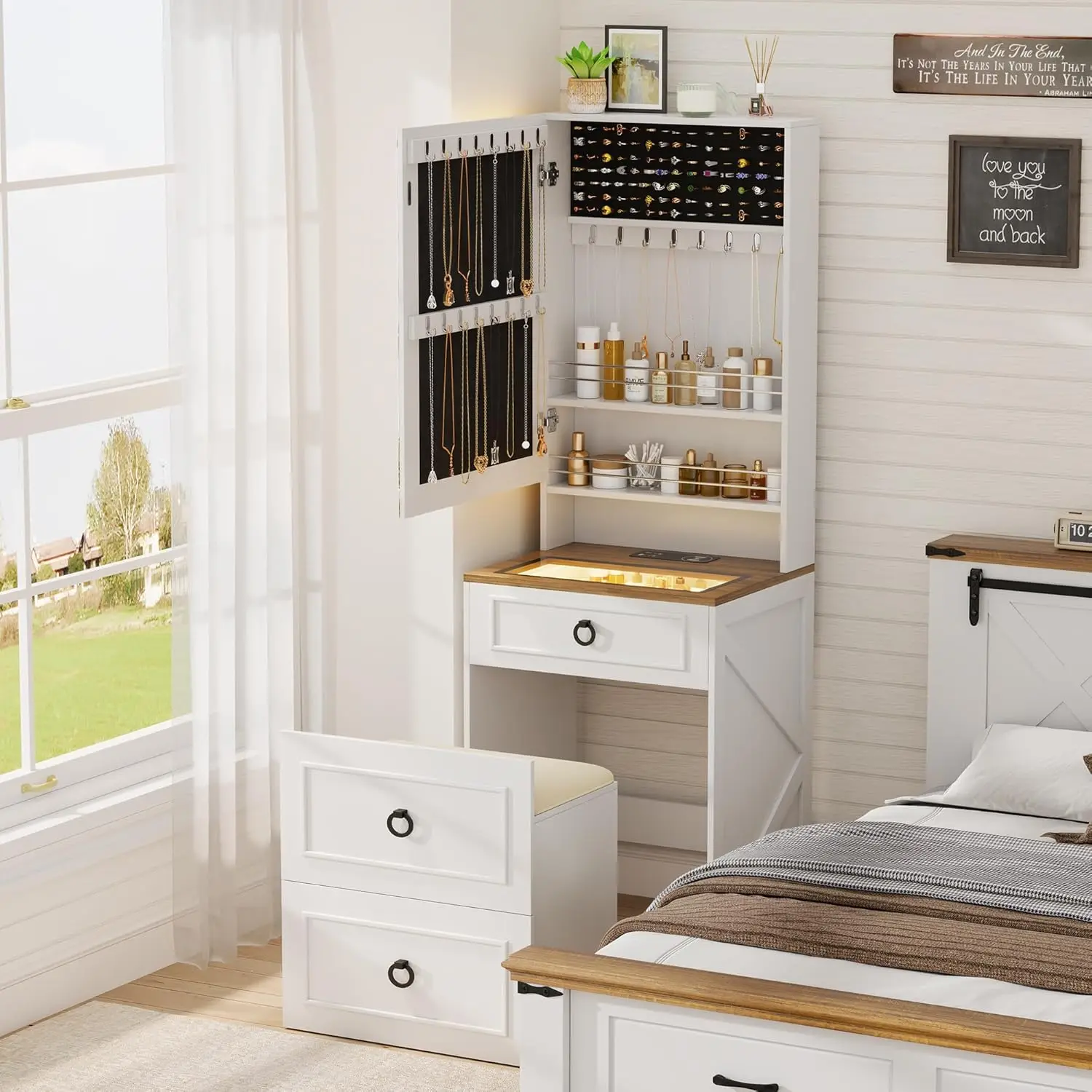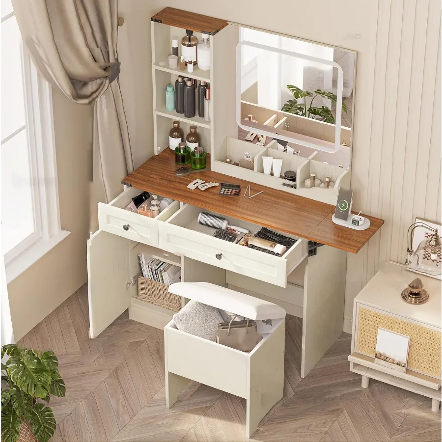 Farmhouse Makeup Vanity Desk with Lighted Mirror, Vanity Table Set with Storage Stool and Charging Station, Dressing Table