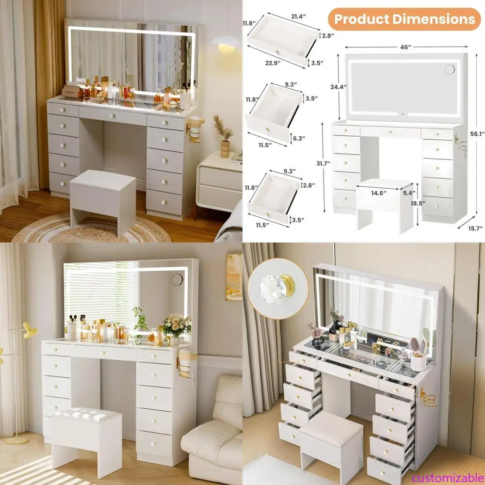 "elegant glass top vanity desk with crystal knobs, 11-drawer makeup vanity set with illuminated mirror and stool, 3-mode lighted