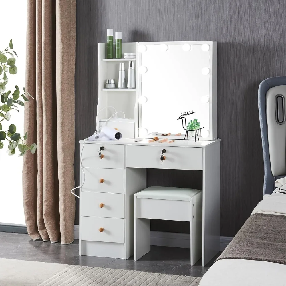 Makeup Vanity Desk with Mirror and Lights, Makeup Vanity Set with Drawers, Small Makeup Vanity Table, Cushioned Stool Set