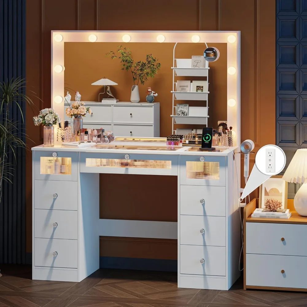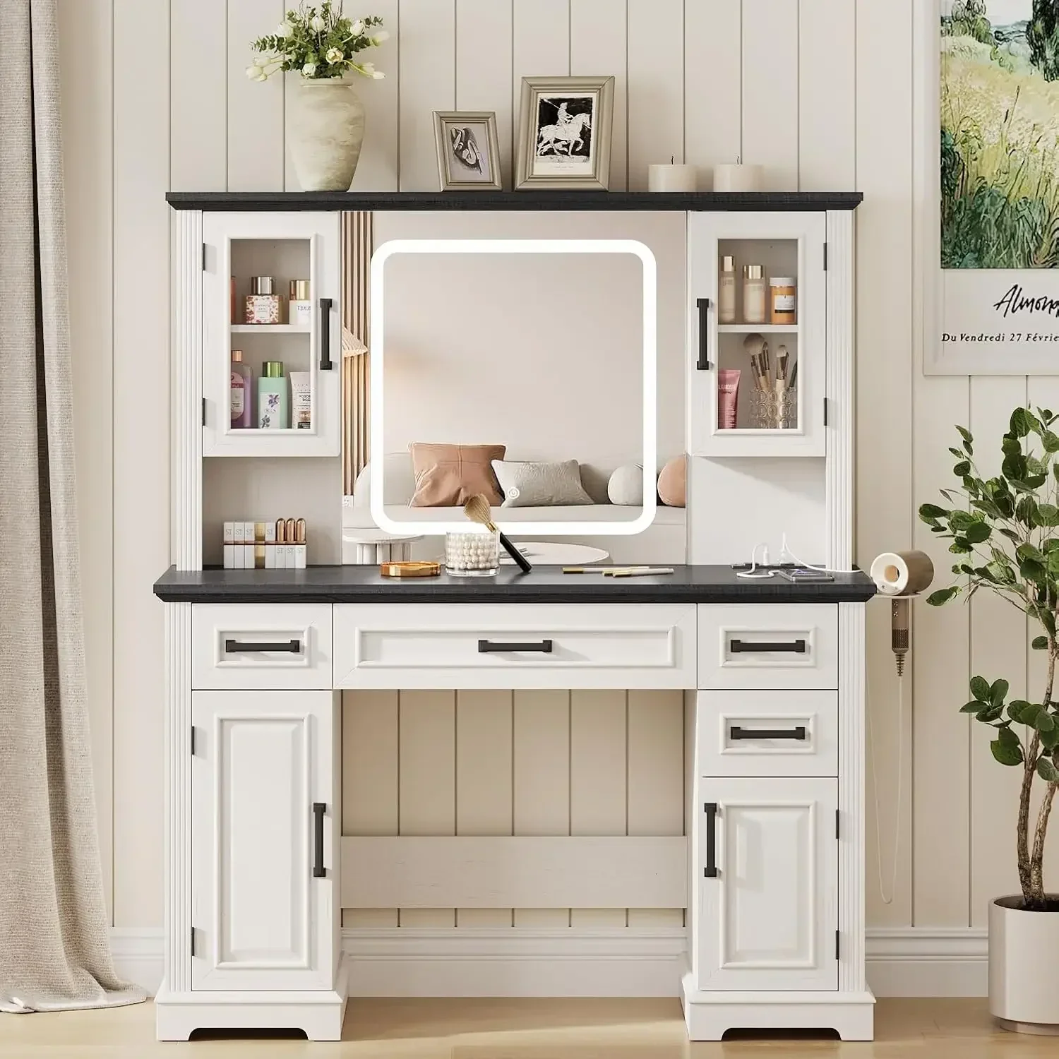 Vanity Desk with Mirror and Lights, 48'' LED Lights Makeup Vanity with 8 Drawers, Farmhouse Vanity Table with 3 Color Modes, Dre