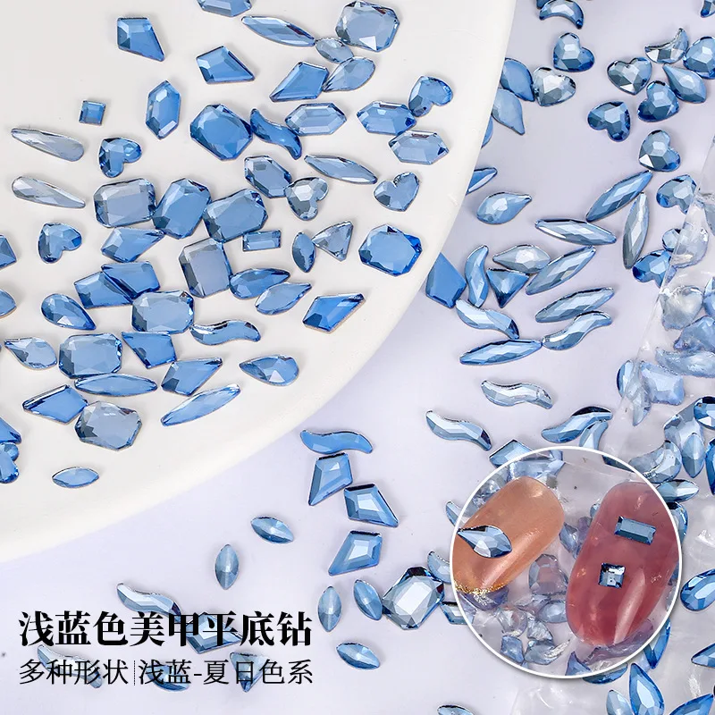 100pcs Light blue irregular diamond blue starry sky love water drop style flat bottom irregular diamond mixed nail accessories