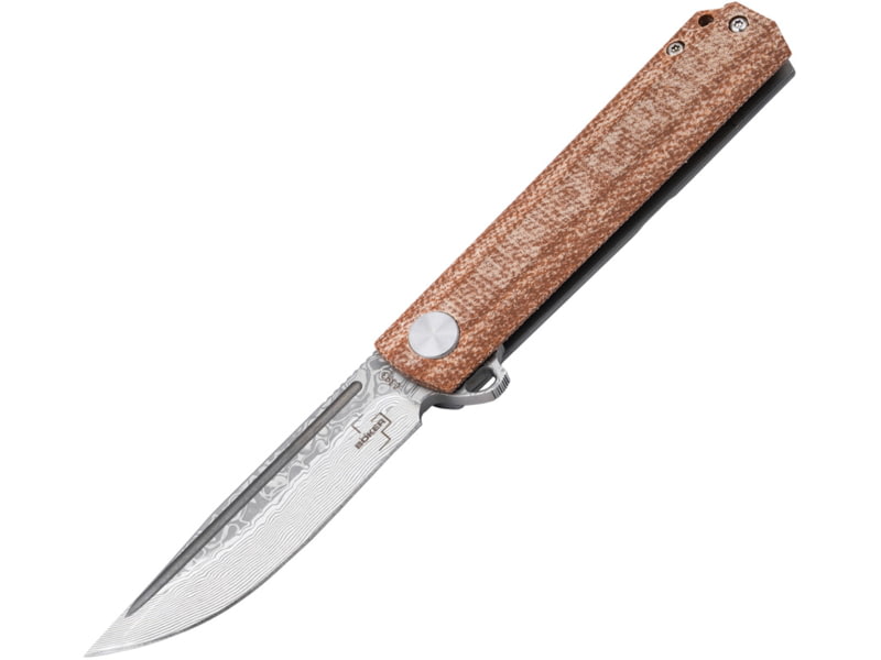 Boker Plus Cataclyst Flipjoint Damascus 2.75 in Folding Knife 01BO479DAM. 75" (9.53cm) closed. 2.75" (6.99cm) Damascus steel blade. Brown canvas micarta handle with stainless back handle. Extended tang. Lanyard hole. Pocket clip. Flip-joint...  Read more