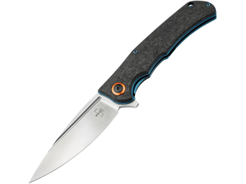Boker Plus Nubilum Linerlock 3.63 in Folding Knife 01BO492. 63" (11.76cm) closed. 3.63" (9.22cm) satin finish D2 tool steel drop point blade. Carbon fiber handle. Extended tang. Lanyard hole. Pocket clip. Blue anodized liners. Black nylon zippered...  Read more