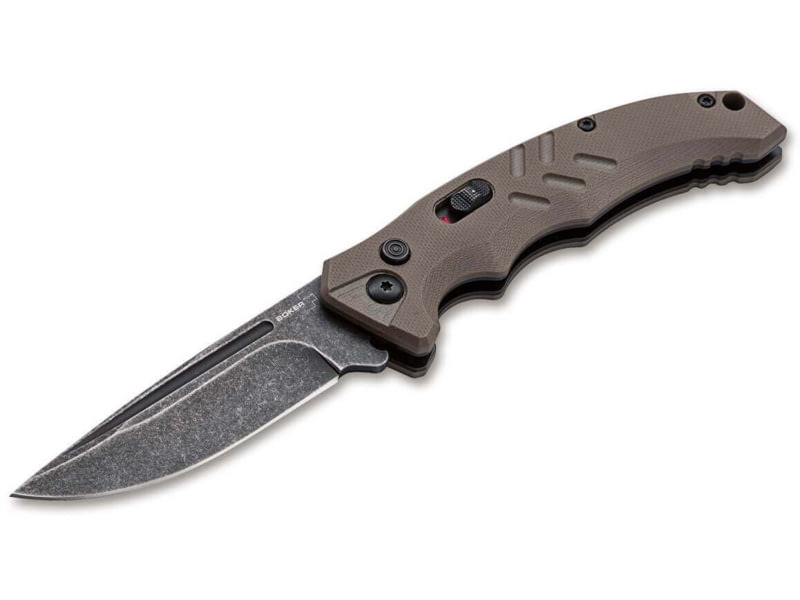 Boker USA Boker Plus Intention Gen2 Auto - 01BO483. Pressing the push button releases the dark stonewash blade made of D2 by the tension of the spring behind it it then flips open automatically. A clean latching slide lock further secures the knife...  Read more