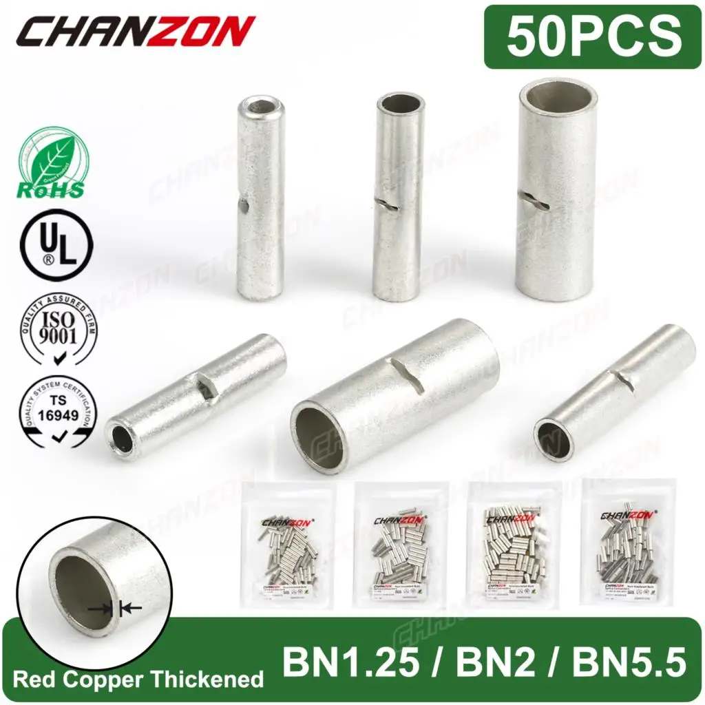 50PC BN1.25 BN2 BN5.5 Tinned Red Copper Non Insulated Butt Joint Wire Connector Kit Crimp Splices Cable Sleeve Terminal 22-10Awg
