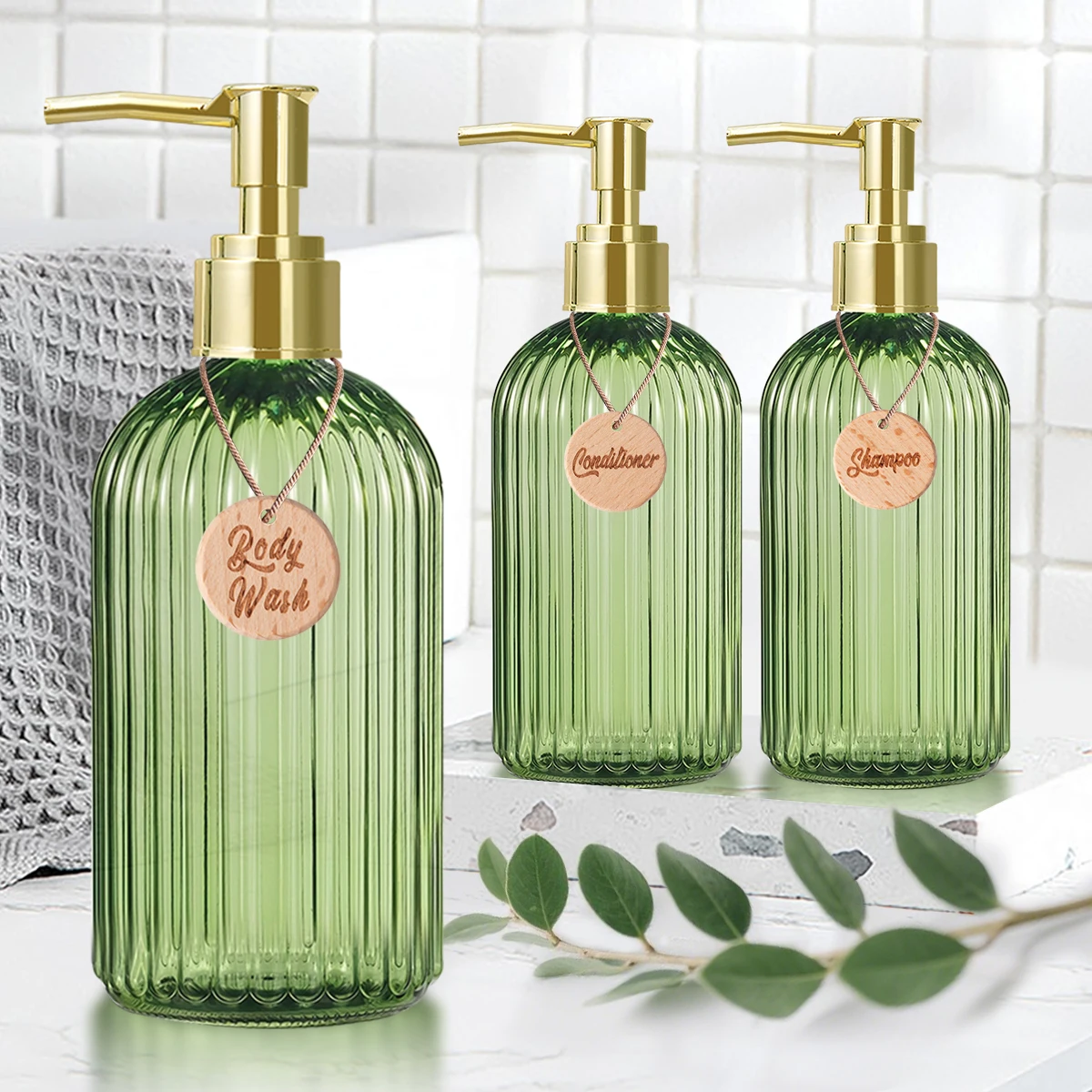 Reusable Shampoo Conditioner Body Wash Bottle Bathroom Shower Soap Dispenser with Wooden Tag Gold Bathroom Accessories