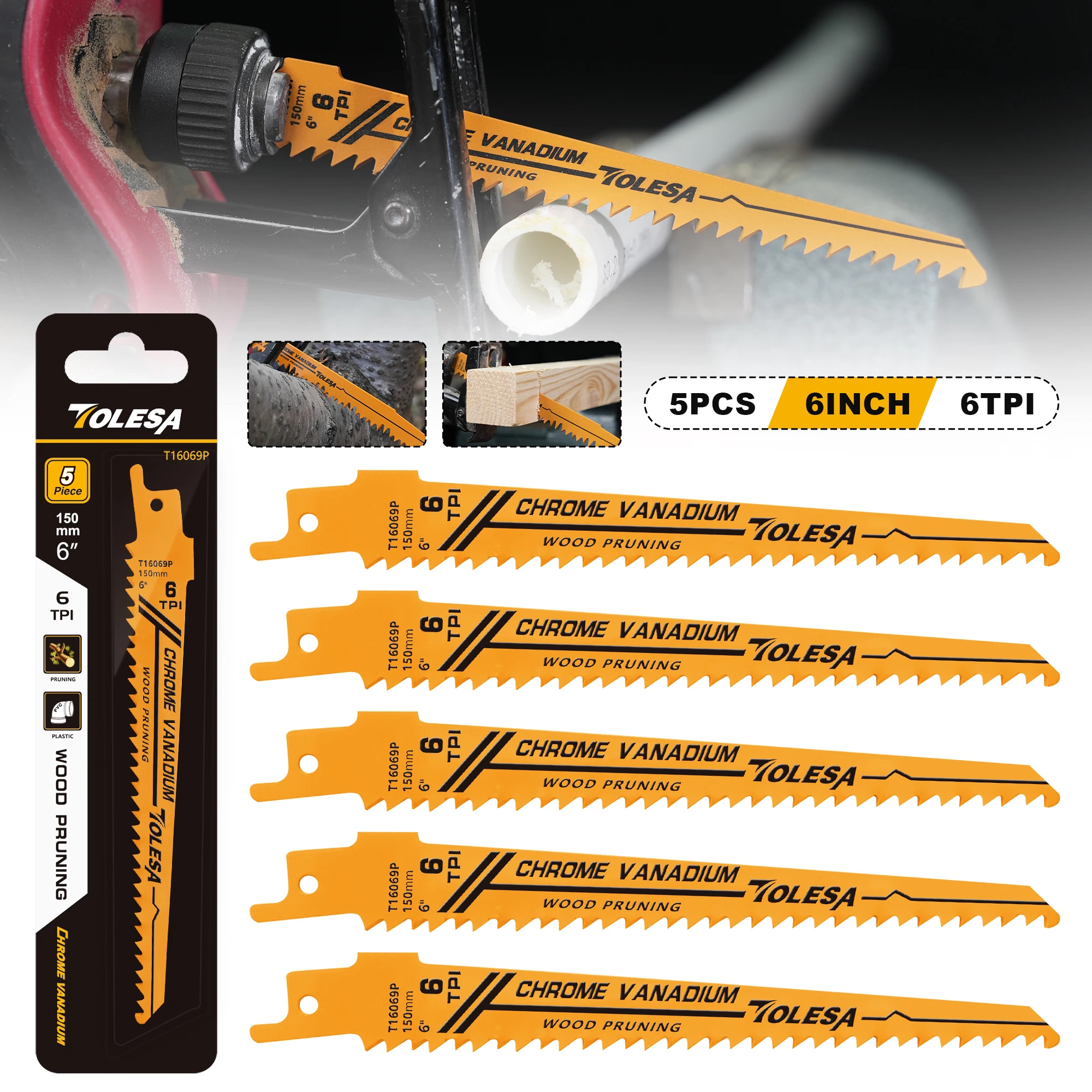 TOLESA 5PCS 6TPI 6 Inch Wood Pruning Reciprocating Saw Blades for Wood and PVC Pipe Cutting CRV Sharp Ground Teeth Sabre