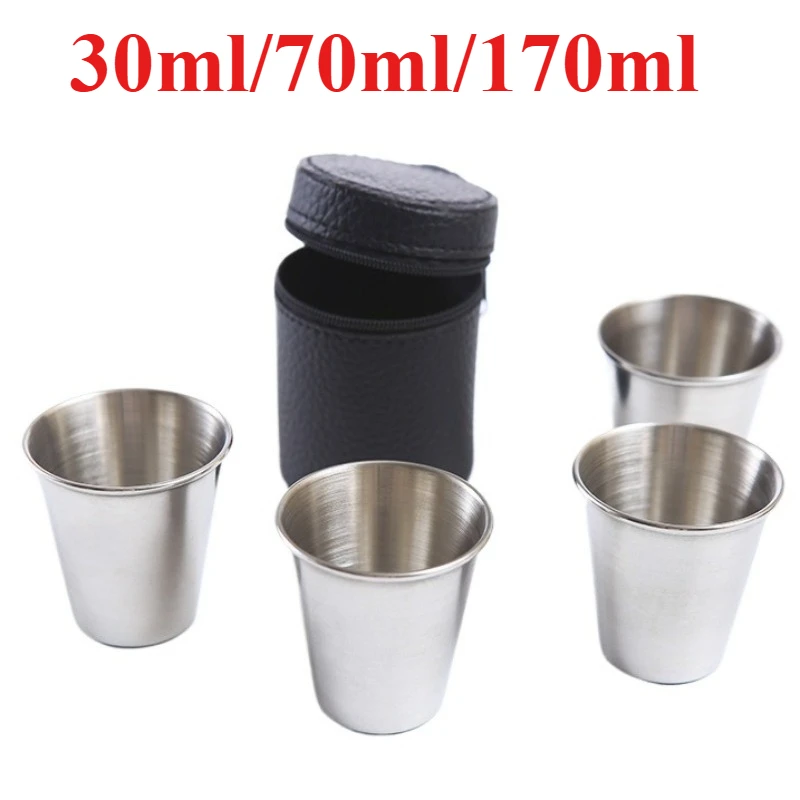 4pcs/set Outdoor Travel Cups Set Camping Tableware Stainless Steel Cup with PU Leather Portable Coffee Wine Beer Whisky Cup