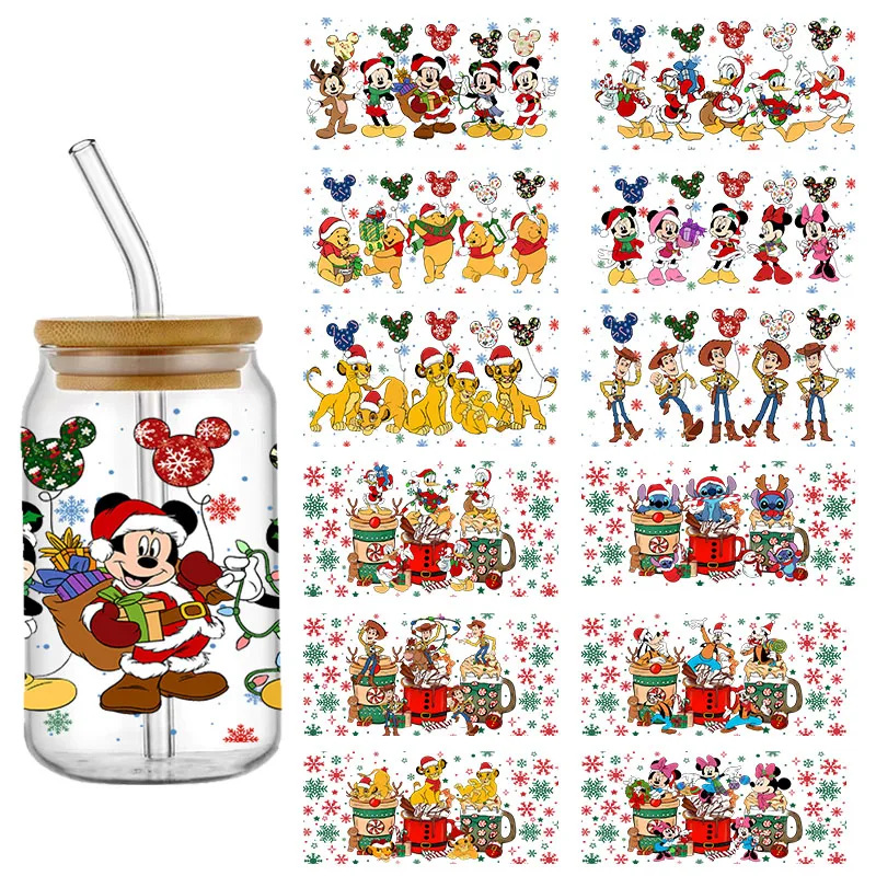 Disney Mickey Christmas 16oz UV DTF Cup Wraps Stitch Winnie Transfer Sticker Cartoon For16oz Glass Plastic Can Waterproof DIY