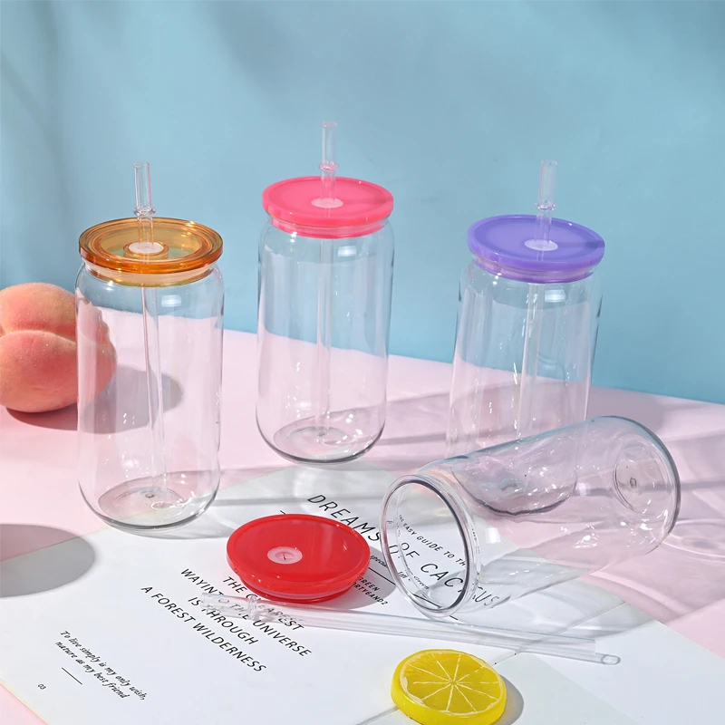 16oz Colorful Lid Transpare Plastic Cup with Lids And Straws Replacement Lids for Can Shaped Iced Coffee Cups Cute Tumbler Cup