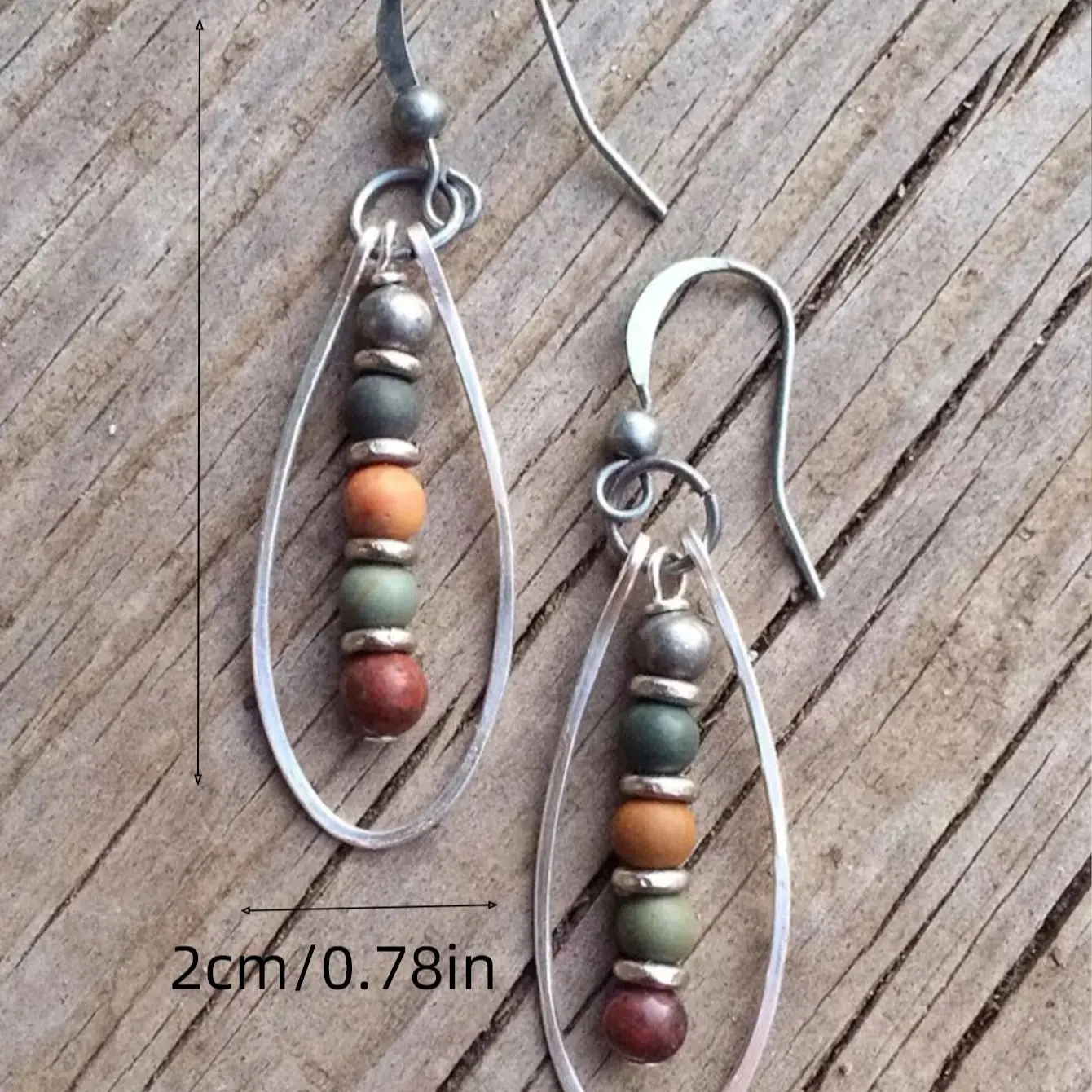 2pcs Vintage Ethnic Style Elliptical Water Droplet Shape Geometry Boho Natural Stone Metal Polychrome Color Earrings Woman Party