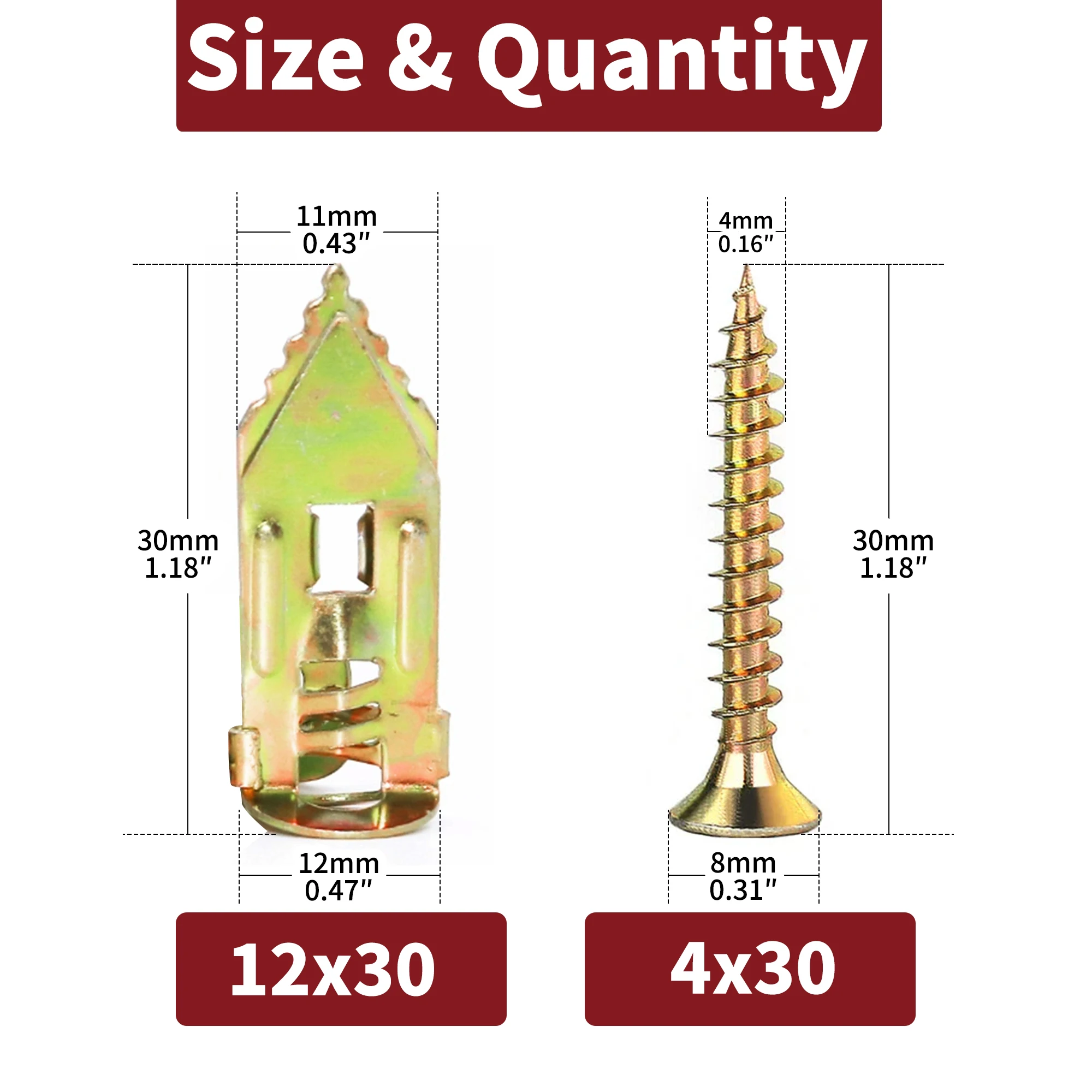 100pcs Self Drilling Drywall Anchors with Screws Expansion Nail Self-Tappe Screw Kit Heavy Duty Metal Wall Anchors 12X30mm