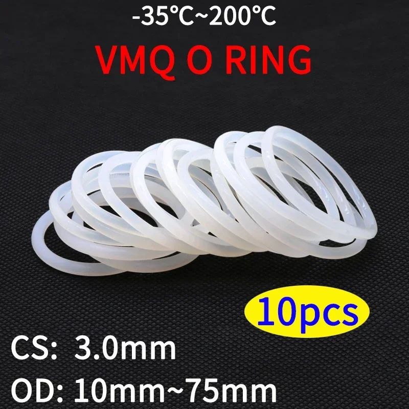 10pcs VMQ O Ring Seal Gasket Thickness CS 3mm OD 10 ~ 75mm Silicone Rubber Insulated Waterproof Washer Round Shape White Nontoxi