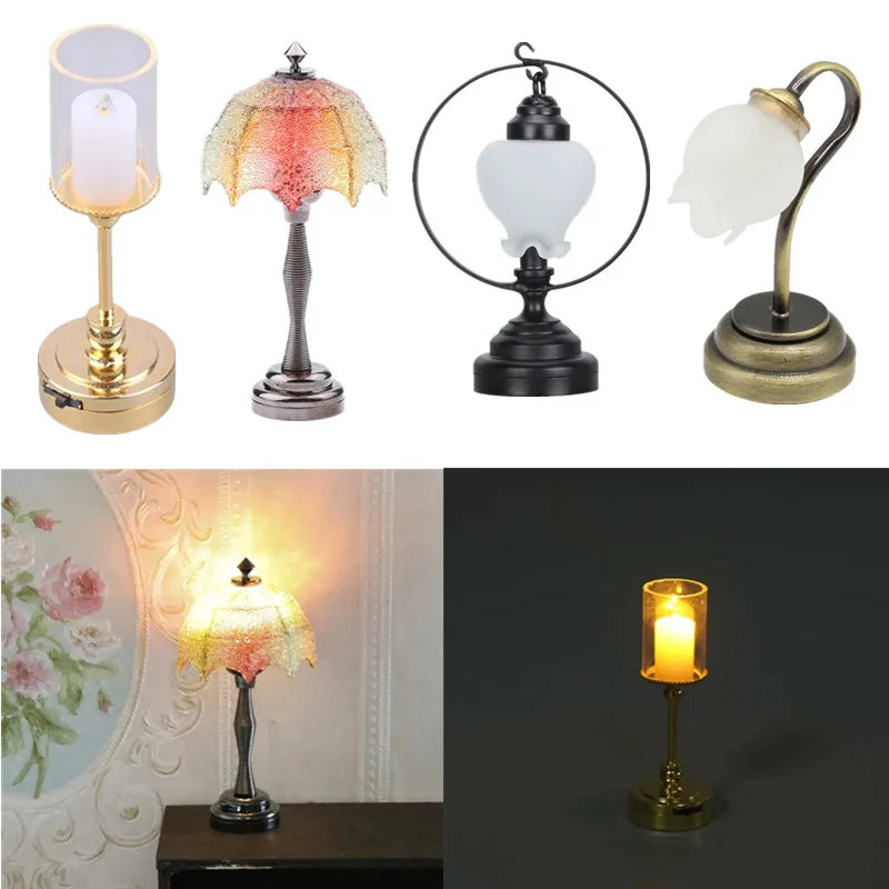 New 1:12 Scale Dollhouse Mini Glass Shade Bedside Table Lamp Miniature Candlestick Desk Lamp Reading Lamp Model Dollhouse Decor