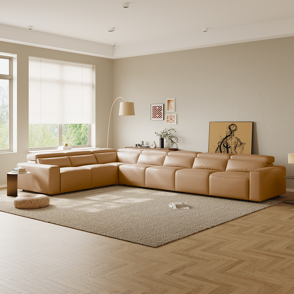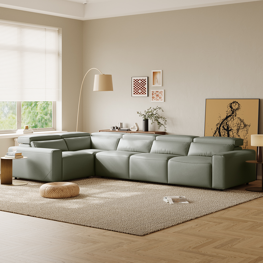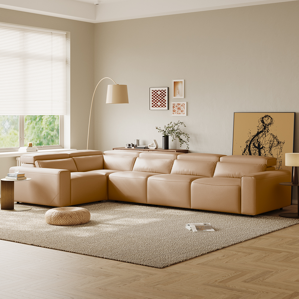 141.14" Power Corner Sofa L-shaped Electric Reclining Couch, 2 Extendable Recliners, Adjustable Headrest, Eco-friendly Leather, USB Charging, Living Room, Khaki