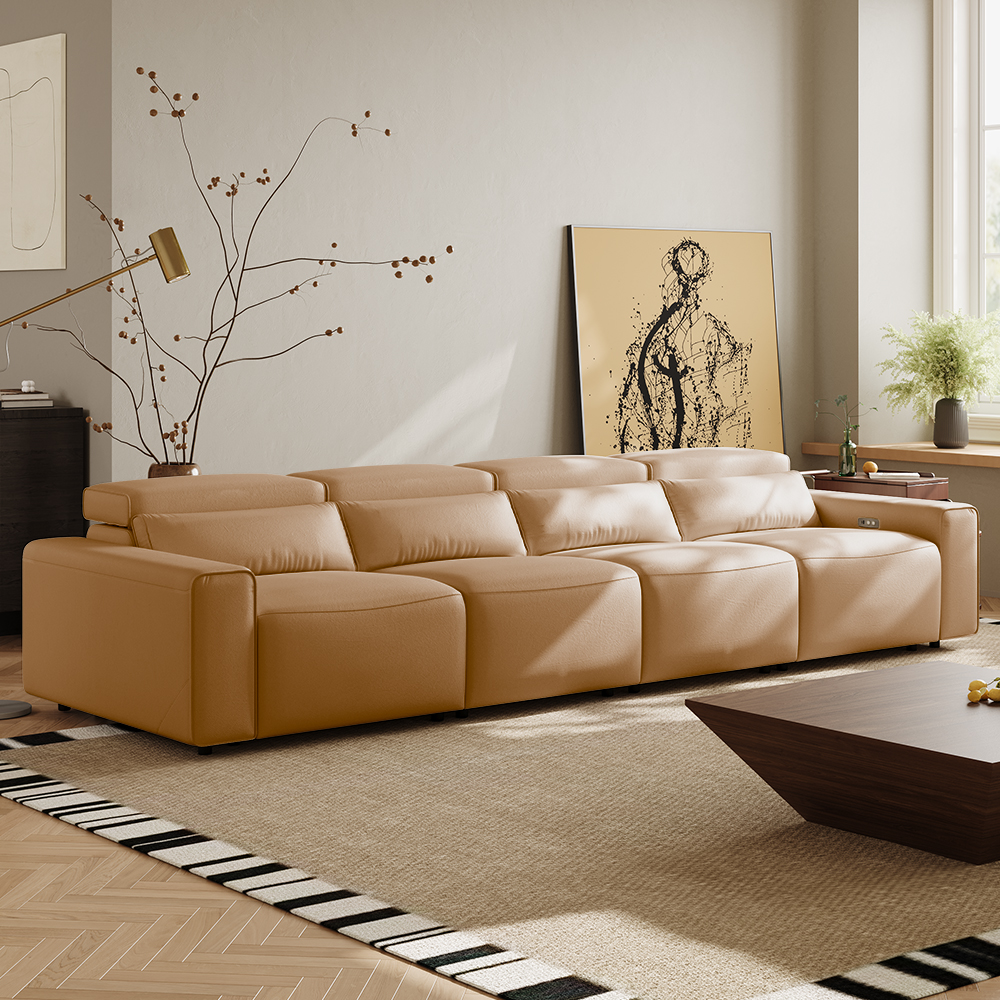 138.82" Electric Modular Recliner Sofa, Power Recliner Couch With 4 Recliner Seats, Eco-friendly Microfiber Leather, USB/Type C Charging Port, Adjustable Headrest, Living Room, Beige
