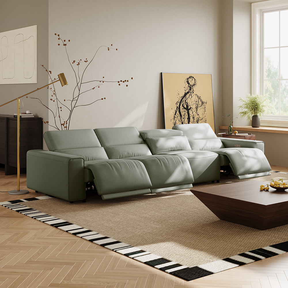 138.82" Power Modular Couch Electric Recliner Sofa, 3 Extendable Recliners, Eco-friendly Leather, Adjustable Headrest, USB Charging Port, Living Room, Khaki