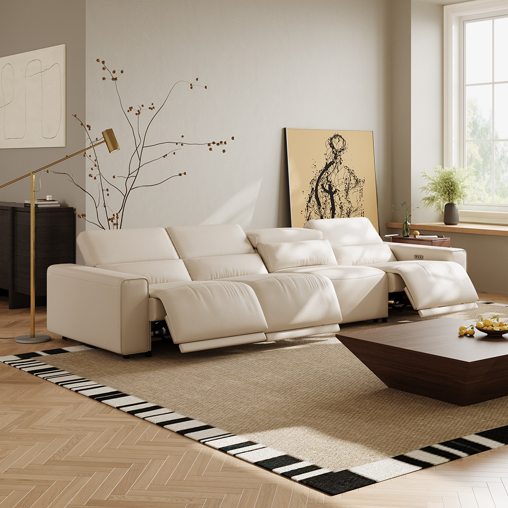 138.82" Power Modular Couch Electric Recliner Sofa, 3 Extendable Recliners, Eco-friendly Leather, Adjustable Headrest, USB Charging Port, Living Room, Beige