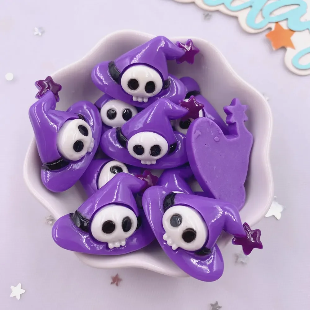 6Pcs Resin Colorful Purple Black 3D Skull Head Ghost Hat Book Figurines Flat back Stone Decor DIY Bow Halloween Scrapbook Crafts