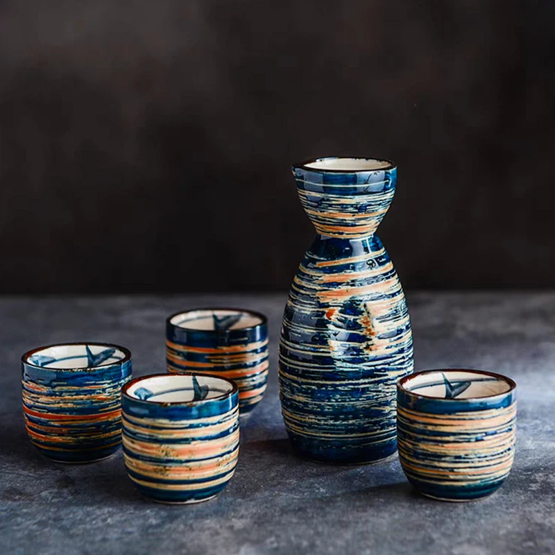 400ml Round Striped Sake Hip Flask Japan Korean Creative Hand-Painted Ceramic Bar Set 1 Pot 2/4 Cups Shochu Drinkware Bottle