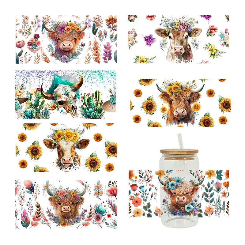3D UV DTF Transfers Stickers 16oz Cup Wrap Cow And Flower Printed For DIY Glass Ceramic Metal Leather Etc. D1985