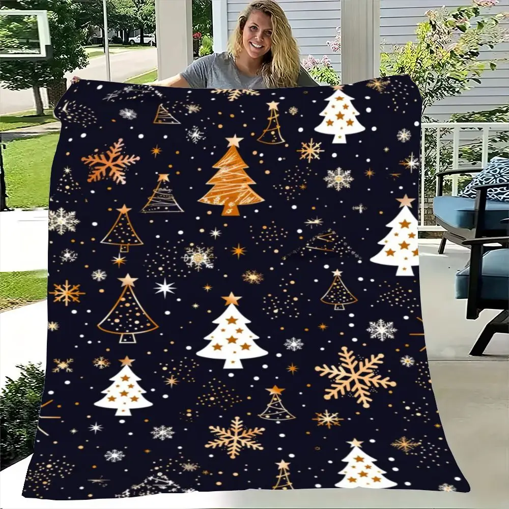 Whimsical Christmas Tree and Snowflake Decorative Throw Blanket - Festive Dark Blue Background with White, Gold, and Orange Illu