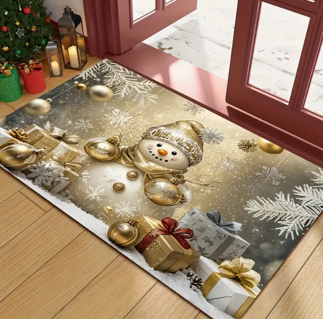 Festive Snowman Christmas Doormat in Gold White with Snowflake Gift Candy Stick Suitable for Home Entrance Outdoor Decoration
