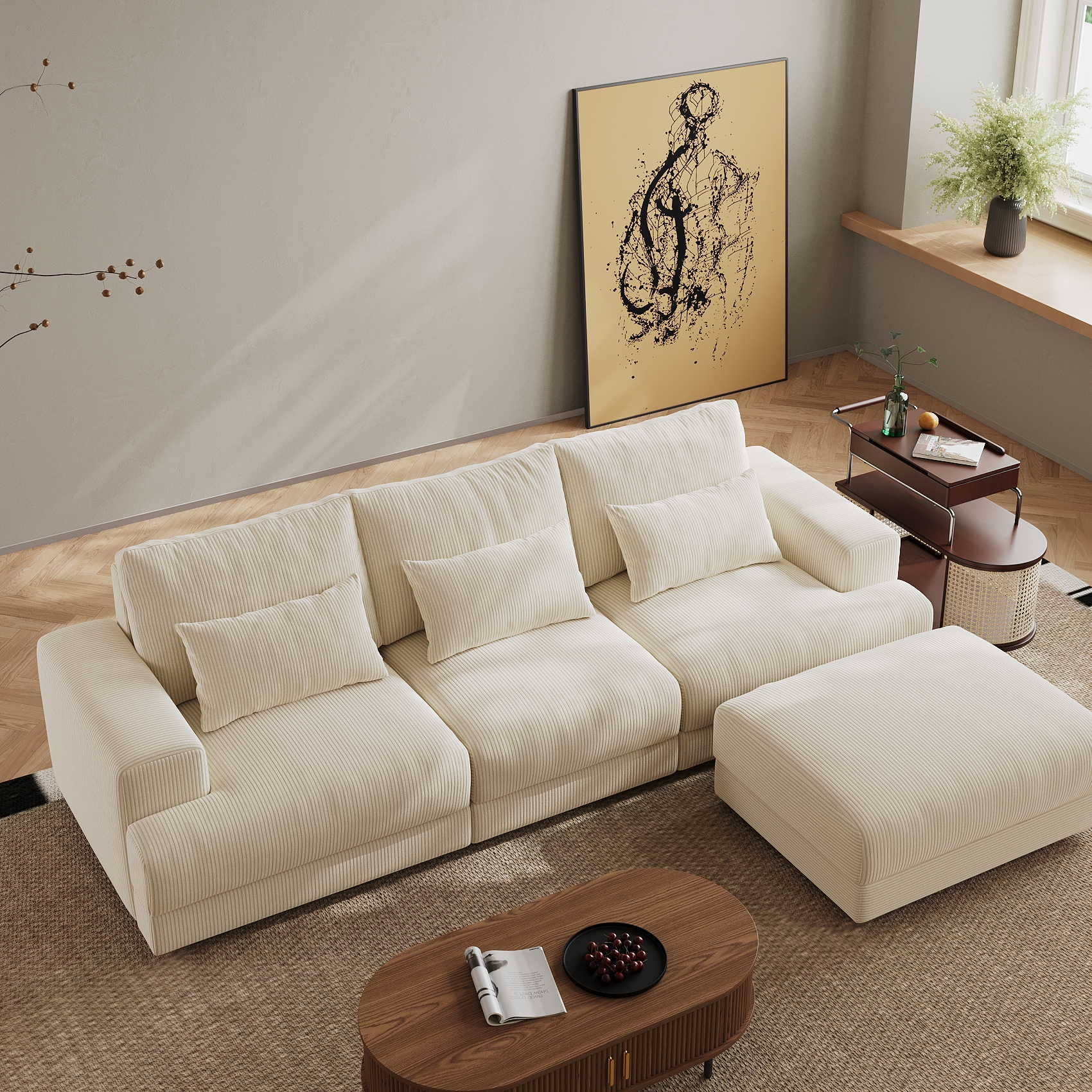 102" Plush Beige Corduroy Sofa with Ottoman, Extra Deep Corduroy Sofa, Comfy Couches for Living Room, Corduroy Fabric, Beige