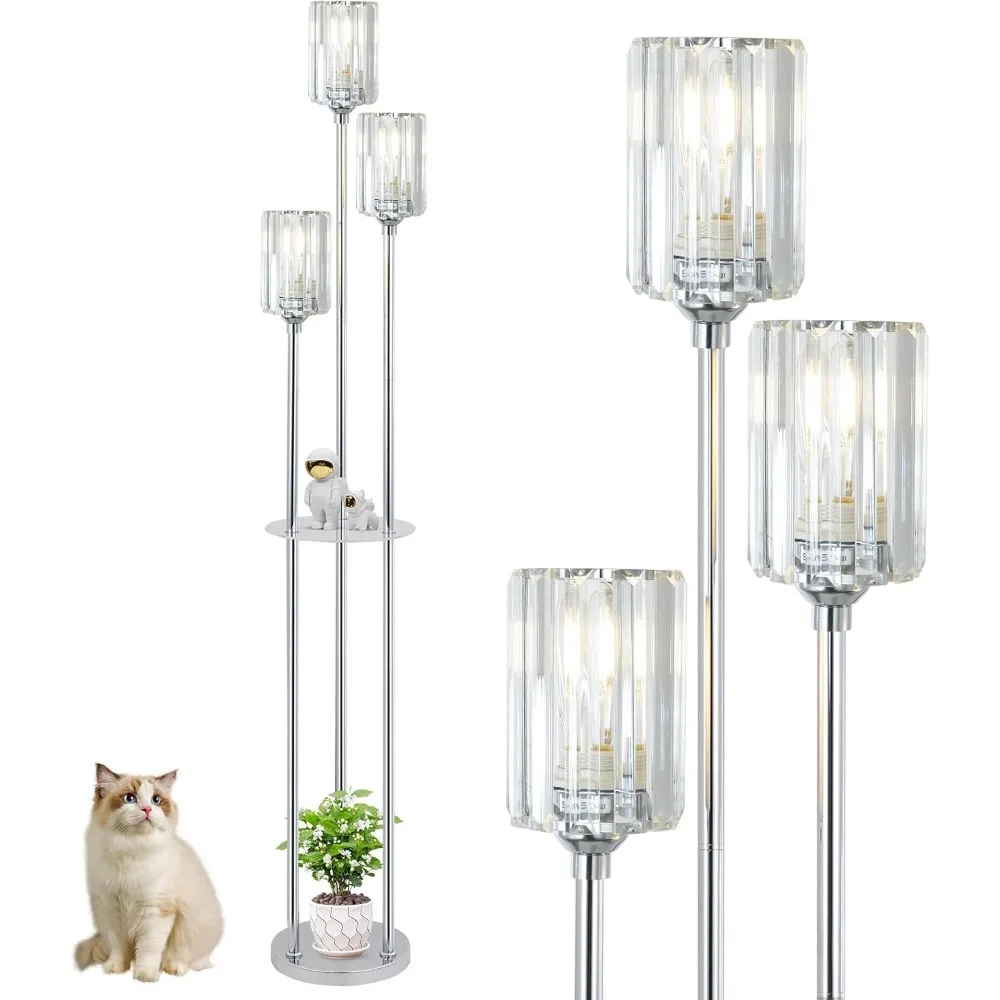 Living Room, Modern Floor Lamp with Shelves, 3-Lights Standing Lamp with Crystal Shade, On/Off Foot Switch, Silver Corner Floor