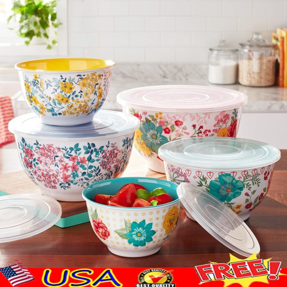 10-Piece Melamine Mixing Bowl Set with Lids Vintage Floral Design Food Prep Serving Storage Kitchen Essentials